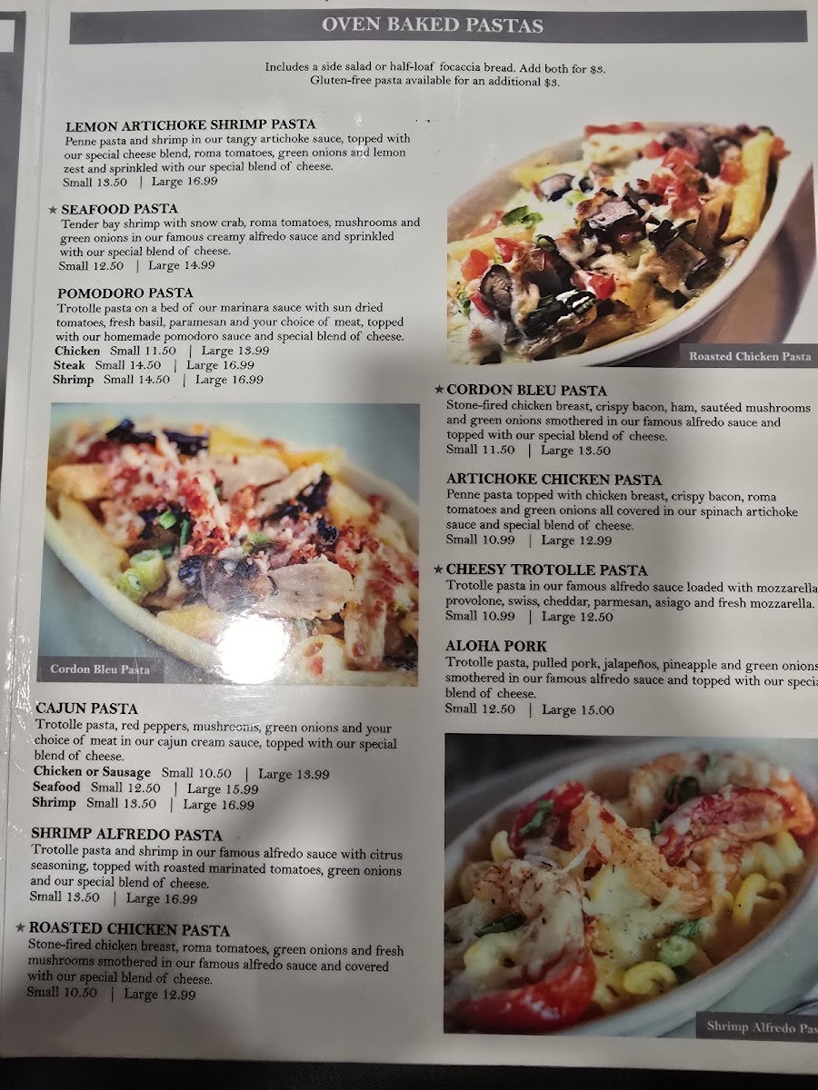 The menu is a delightful fusion of flavors, featuring **oven-baked pastas** that are simply irresistible. For just $10.50, you can indulge in the enticing **Small Cajun Pasta**, which showcases Trotolle pasta mingling with red peppers, mushrooms, and a choice of savory proteins topped with a rich cajun cream sauce. If you’re in the mood for something tropical, the **Small Aloha Pork Pasta** ($12.50) combines pulled pork with jalapeños and pineapple in a creamy alfredo—a dish that transports you straight to the beach!